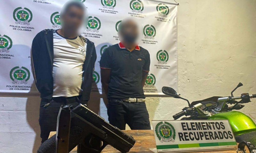 #Medellín | Gracias a la rápida reacción de #MiPolicíaDelCuadrante se logró la captura de estos 2 sujetos que minutos antes hurtaron a un ciudadano en el sector del Poblado, los elementos hurtados, la motocicleta y 01 pistola traumática son dejados disposición de la @FiscaliaCol pic.twitter.com/ksHGut61w6