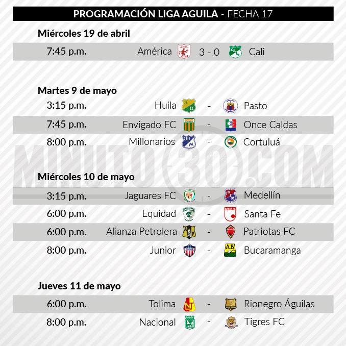 La División Mayor del Fútbol Profesional colombiano reveló los horarios en los que se jugará la fecha 17 de la Liga Águila I- 2017.