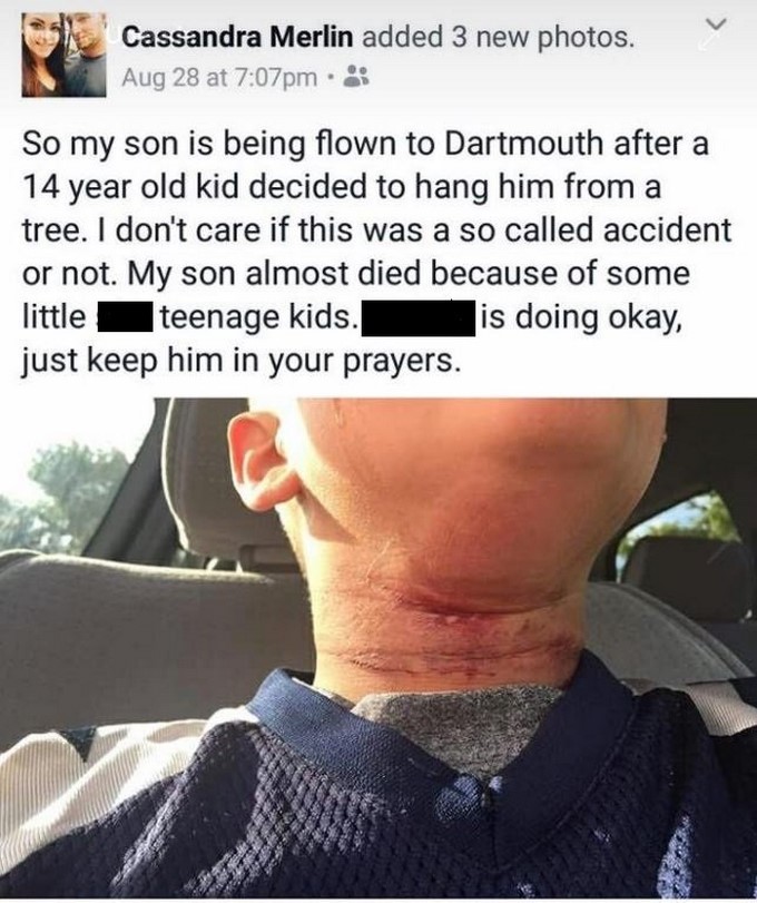 La mamá del niño denunció el hecho en redes sociales, donde publicó una imagen del daño, “Mi hijo está siendo trasladado a Dartmouth después de que un niño de 14 años decidió colgarlo de un árbol”.