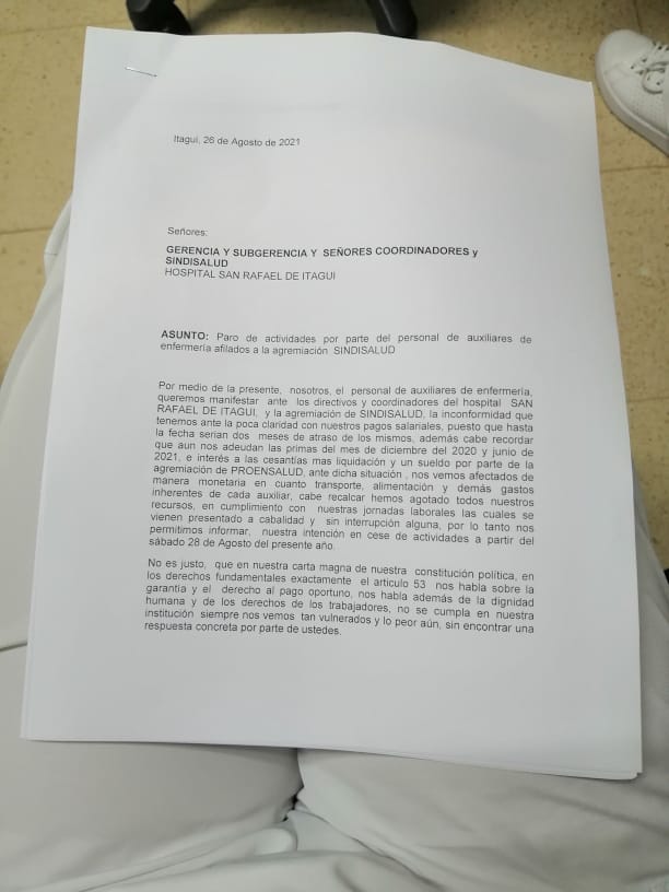Con la siguiente carta, el personal de la salud demostró su interés de salir a paro, de no cumplirse sus peticiones.