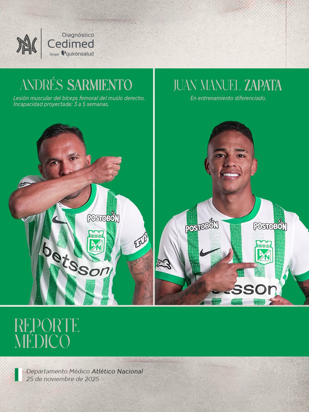 Resumen: El Departamento Médico de Atlético Nacional emitió un reporte de lesiones previo al juego contra Junior, señalando que cuatro jugadores clave están bajo observación. Las bajas incluyen al central Juan José Arias (retorno según evolución) y al lateral Joan Castro (tendinopatía de Aquiles izquierdo, sin fecha clara de regreso). La lesión más grave es la del extremo Andrés Sarmiento, quien estará inactivo de 3 a 5 semanas por una lesión muscular en el bíceps femoral derecho. Además, el volante Juan Manuel Zapata sigue con entrenamiento diferenciado y aún no está disponible al 100% para ser considerado por el cuerpo técnico.