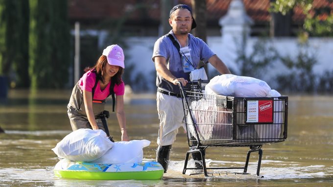 En su trayecto sobre lo que fue una calle y que ahora parece un canal, transportando a residentes que buscan recoger pertenencias de sus hogares, los voluntarios se cruzan con equipos de rescate y bomberos, quienes van de casa en casa cerciorándose que no hayan personas atrapadas al interior de las viviendas.