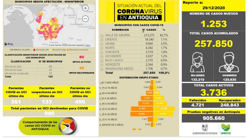 La Secretaría Seccional de Salud de Antioquia, reportó para hoy martes 29 de diciembre, 1.253 casos nuevos de Covid-19 en el departamento y la cifra de contagiados se eleva a 257.850.