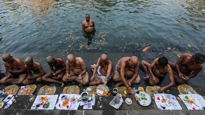 Los bengalíes, independientemente de su edad, estatus social o género, se despertaron hoy antes del amanecer para realizar sus oraciones y a continuación tomaron un baño sagrado en las orillas del Ganges para rendir homenaje a sus antepasados.