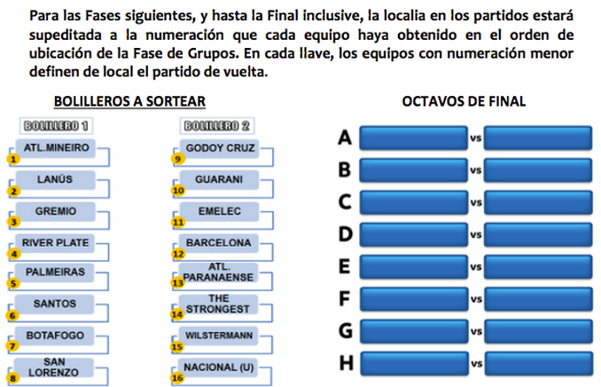 En la Libertadores, también se hará con dos bolilleros, conforme a la ubicación que tuvieron en sus respectivos grupos. Esta determinará la localía para el partido de vuelta.
