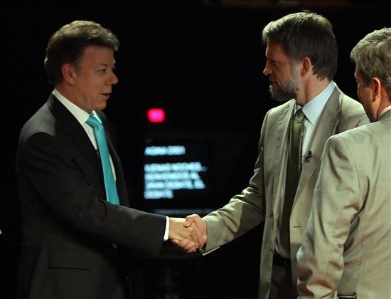 Foto: BOGOTÁ (COLOMBIA), 27/05/2010.- El candidato a la presidencia de Colombia por el partido Verde, Antanas Mockus (d), saluda a su contendor del Partido de la U, Juan Manuel Santos hoy, jueves 27 de mayo de 2010, durante un debate televisado celebrado en Bogotá (Colombia). En el debate también participaron los candidatos a la presidencia de Colombia Rafael Pardo, Gustavo Petro, German Vargas Lleras y Noemi Sanin. EFE/MAURICIO DUEÑAS