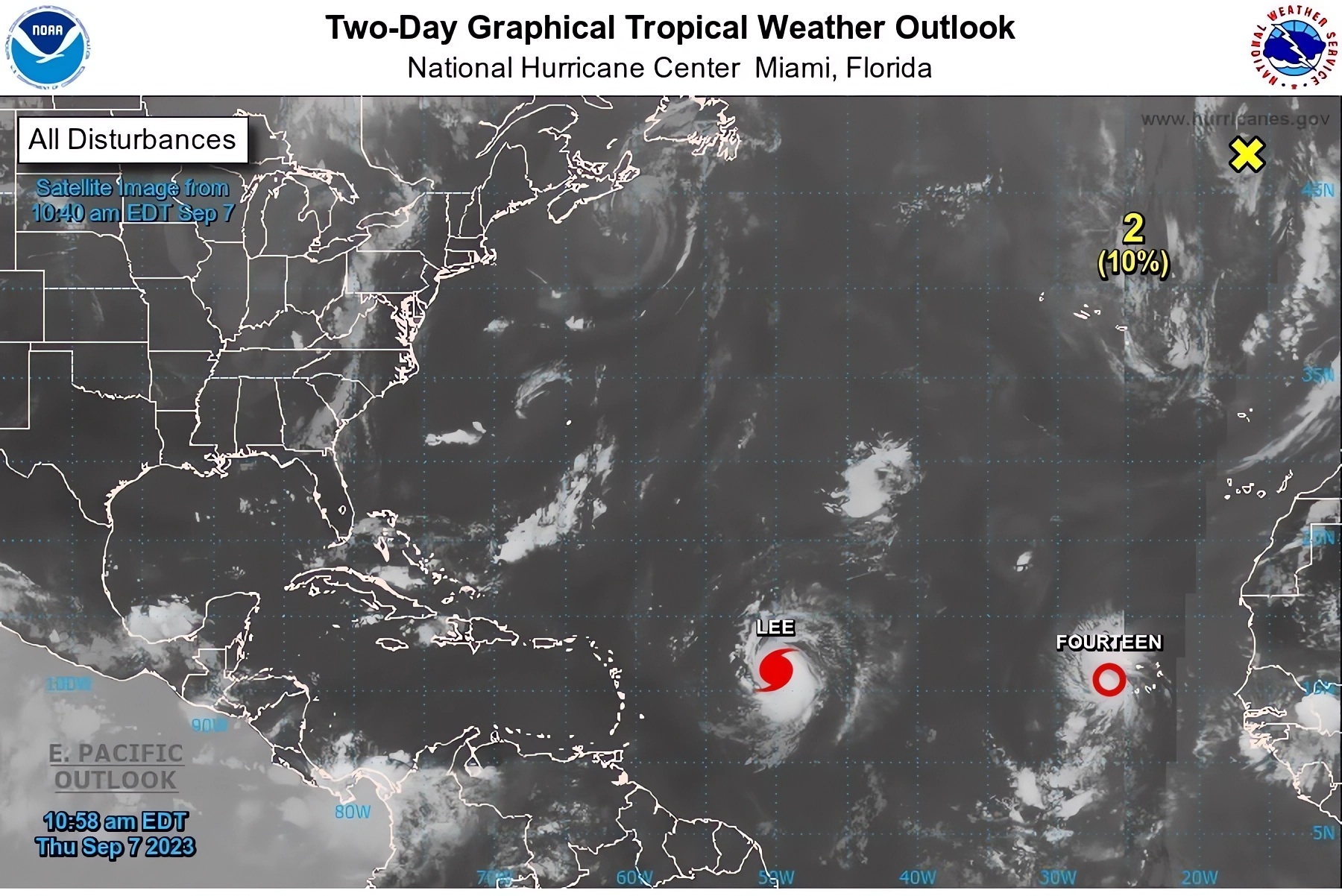 Los meteorólogos del NHC advirtieron que Lee "permanecerá como un huracán mayor durante el fin de semana" mientras se desplaza hacia el oeste-noroeste y que generará a su paso "grandes marejadas" que alcanzarán el fin de semana las Antillas Menores, las Islas Vírgenes Británicas y de Estados Unidos y también Puerto Rico.