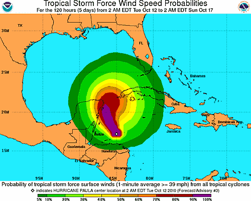 Con vientos máximos sostenidos de 160 kilómetros por hora, el Paula se convirtió en un huracán categoría 2 en la escala Saffir-Simpson, esto fue dado a conocer por el Centro Nacional de Huracanes en su boletín de las 12:30, hora de Miami.