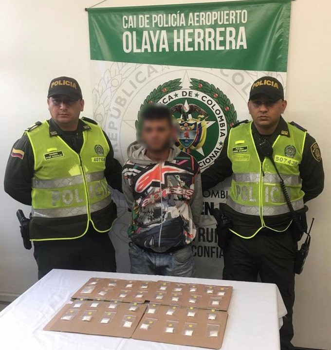 Controles llevados a cabo alrededor del Aeropuerto Olaya Herrera de Medellín lograron la captura de este sujeto que iba ‘caleto’ en dosis de drogas cuando estaba por la zona de carga del terminal aéreo.