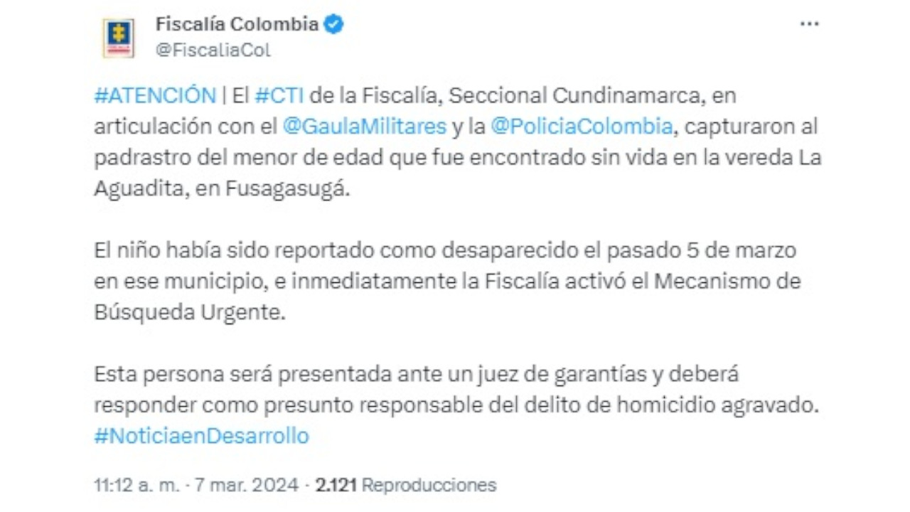 El menor fue hallado muerto junto a una quebrada del municipio de Fusagasugá, en horas de la tarde del pasado miércoles 6 de marzo. El lamentable hallazgo se dio un día después de que fuera reportado como desaparecido.