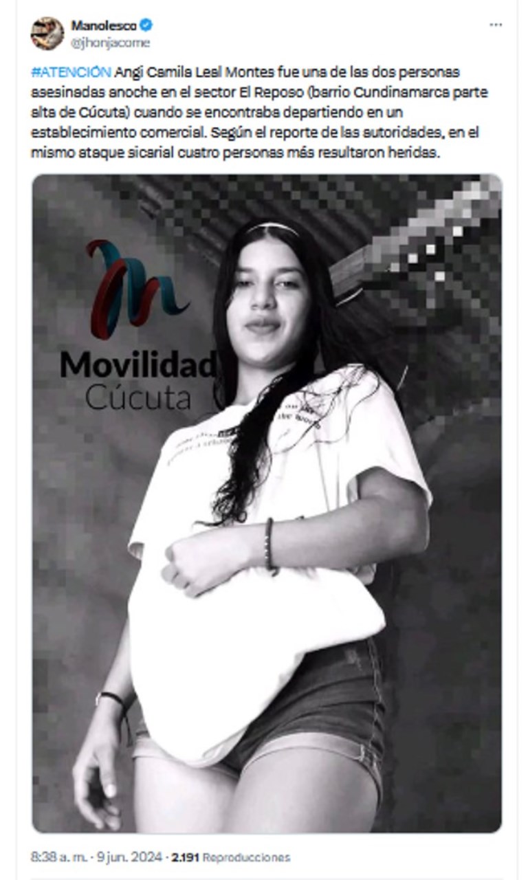 Angi Camila Leal Montes es una de las víctimas que deja el hecho de sangre ocurrido en el sector El Reposo de la capital nortesantandereana, según reporta @Manolesco a través de twitter.