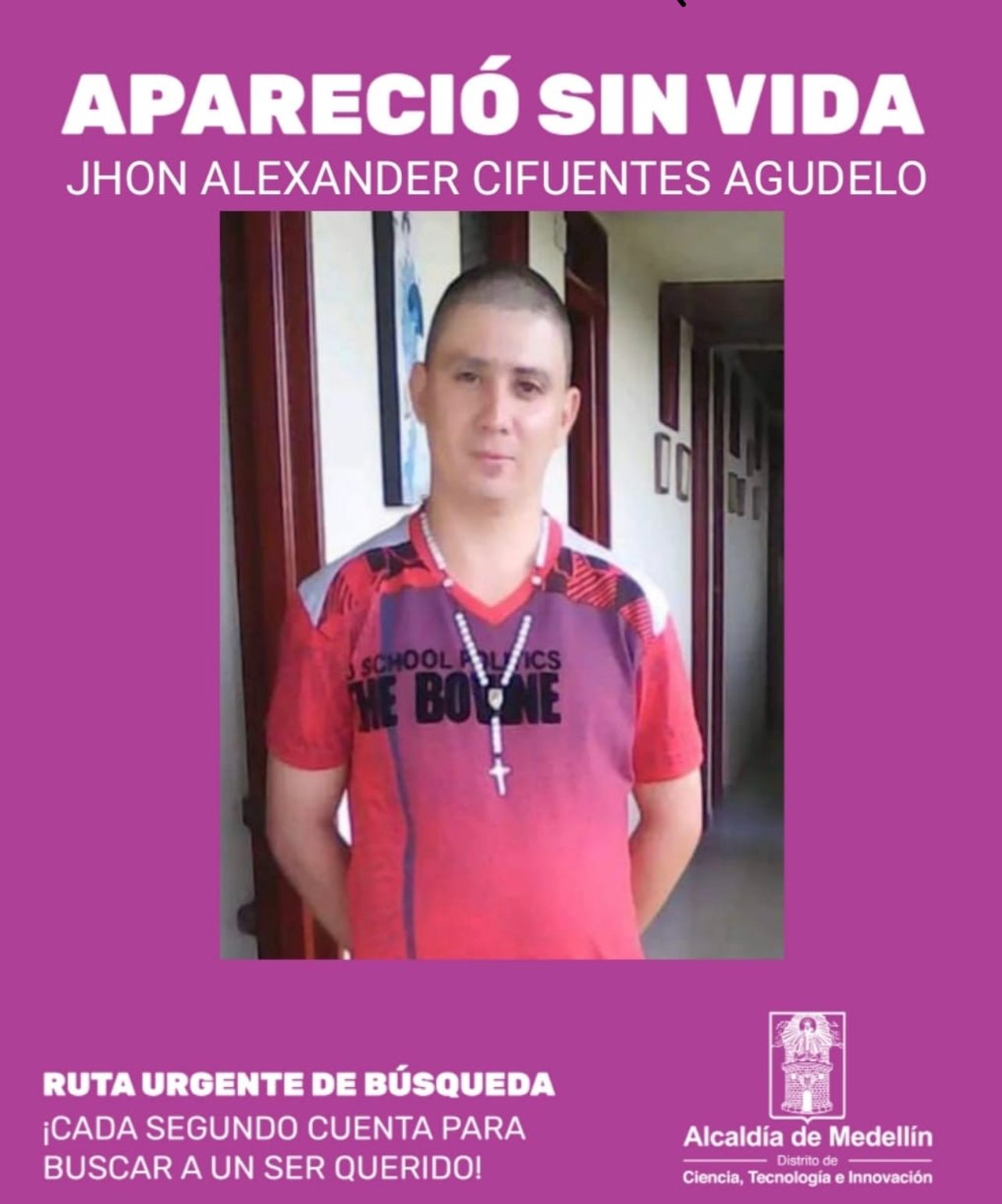 En la mañana de este viernes 16 de junio, dos días después se pudo identificar que las partes del cuerpo encontradas correspondían, al ya reportado como desaparecido, Jhon Alexander C., A., de 32 años, quien había sido visto por última vez en el barrio Olaya Herrera de Medellín.