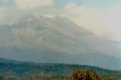 En una de las laderas del volcán puede verse lo que parece ser un rostro humanoide en la pared rocosa, que recuerda mucho a las típicas representaciones de rostros extraterrestres. Este no parece ser un caso de pareidolia –de ilusiones ópticas producidas por los juegos de luz y sombra–, sino un glifo, o más específicamente un petroglifo, un diseño hecho directamente en la roca.
