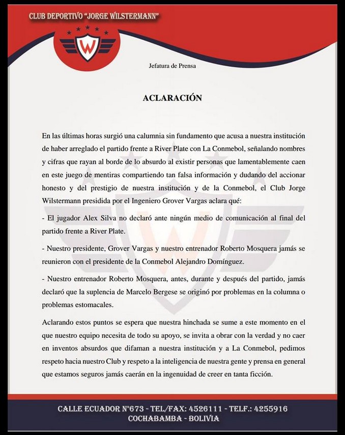 Luego de la estruendosa goleada por 8-0 que les propinó River Plate en cuartos de final de Libertadores, los directivos del Jorge Wilstermann decidieron emitir un comunicado para “aclarar” algunos puntos.