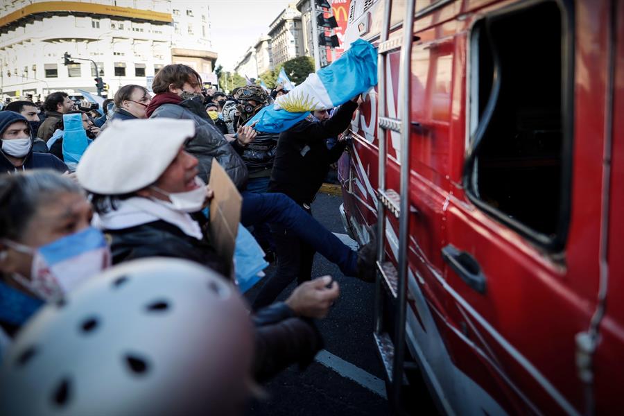 “Nueva normalidad = Miseria”, rezaba una extensa bandera celeste y blanca que encabezaba una columna de manifestantes frente al Obelisco, en el centro de la capital argentina, con pancartas pidiendo “libertad” y “justicia”, además de críticas al Ejecutivo, y que luego se dirigió a la Casa Rosada, la sede gubernamental en la histórica Plaza de Mayo.