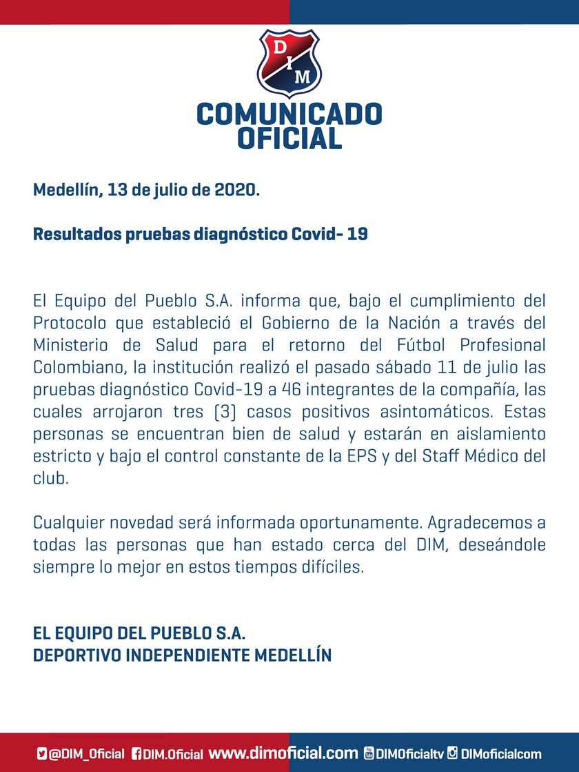Minuto30.com- Deportivo Independiente Medellín confirmó a través de un comunicado, que también tiene positivos por Covid-19.