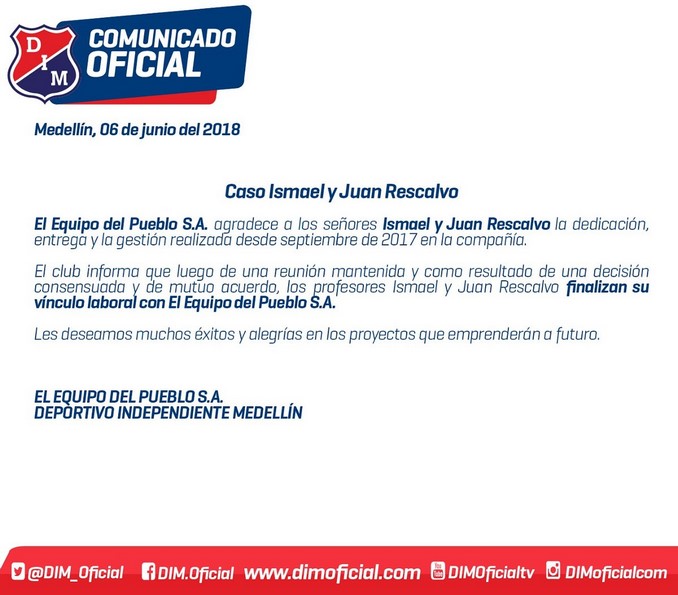 Minuto30.com- A través de un comunicado Independiente Medellín confirmó la salida de Ismael Rescalvo de la dirección técnica del conjunto antioqueño. Según se explica en la publicación, “como resultado de una decisión consesuada y de mutuo acuerdo, los profesores Ismael y Juan Rescalvo finalizan su vínculo laboral con el ‘Equipo del Pueblo’.