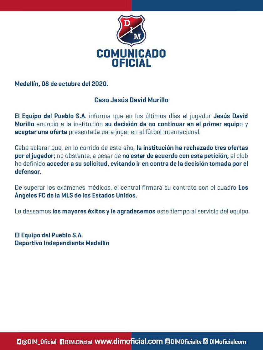 Sin embargo, ante la insistencia del futbolista de buscar un mejor futuro, el DIM decidió aceptar la propuesta que llegó de los Ángeles FC, de la MLS, a donde será transferido si pasa con normalidad los chequeos médicos del equipo norteamericano.
