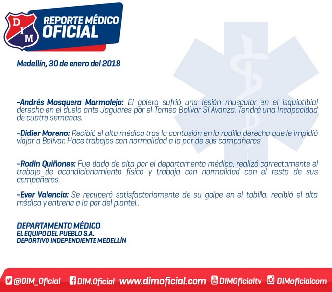 Minuto30.com- Independiente Medellín dio a conocer un parte sobre la evolución de los jugadores que en los últimos días han estado bajo los cuidados del departamento médico del equipo.