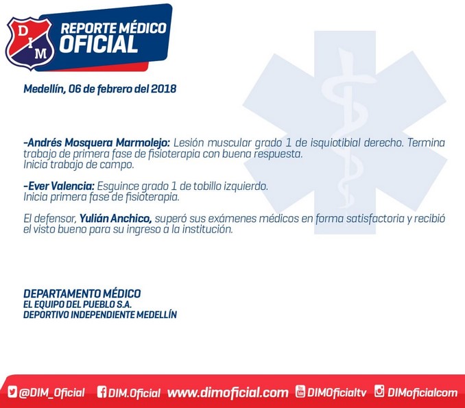 Minuto30.com- Independiente Medellín dio a conocer este martes un parte sobre los jugadores que aún están bajo los cuidados del departamento médico, en cabeza de Edgar Méndez.