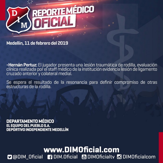 Minuto30.com- Independiente Medellín dio a conocer este lunes en reporte médico de Hernán Pertuz.