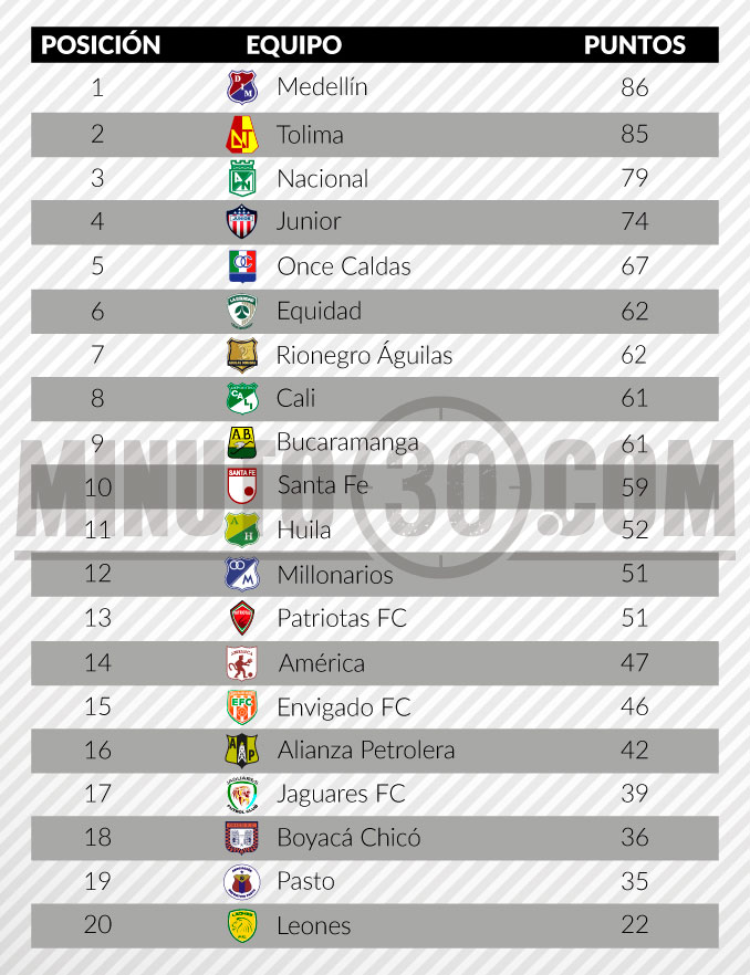 Por su parte, Deportes Tolima, campeón del primer semestre, se ubicó segundo; mientras que Atlético Nacional se ubicó tercero, a pesar de haber quedado eliminado en la fase de ‘Todos Contra Todos’, de la Liga II.