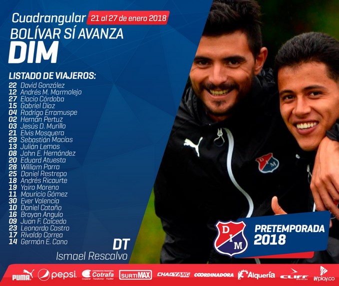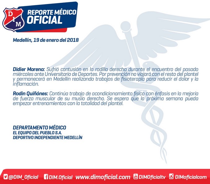 Tampoco viajó con el grupo Rodin Quiñones, que “debe continuar su acondicionamiento muscular esta semana” en la capital de Antioquia.