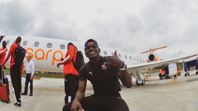 Jesús David Murillo, al igual que la mayoría de sus compañeros, le pusieron una cara amable al viaje, a pesar de lo extenso. Foto: @DIM_Oficial