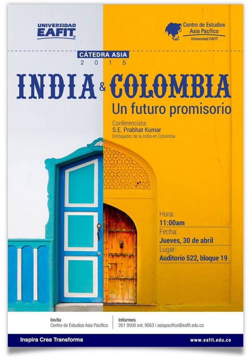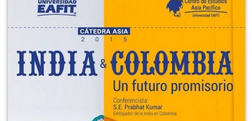 La Embajada de la India en Colombia, su Consulado en Medellín y el Centro de Estudios Asia Pacífico de la Universidad Eafit, invitan a la conferencia “India y Colombia: un futuro promisorio” que será ofrecida por el Señor Embajador, Prabhat Kumar en la Universidad Eafit el próximo jueves 30 de abril.