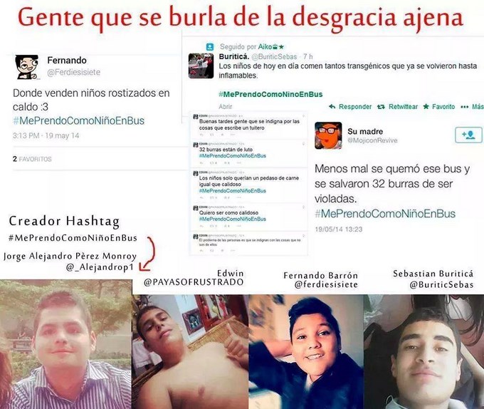 Un sentimiento generalizado de indignación ha provocado en el país, las publicaciones en redes sociales del joven universitario, Alejandro Pérez, en los que en tono satírico, hace chistes sobre la tragedia ocurrida en el municipio de Fundación, Magdalena., donde perecieron calcinados 32 niños. Con el hashtag #MePrendoComoNiñoEnBus, Pérez posteó en sus redes sociales comentarios alusivos […]