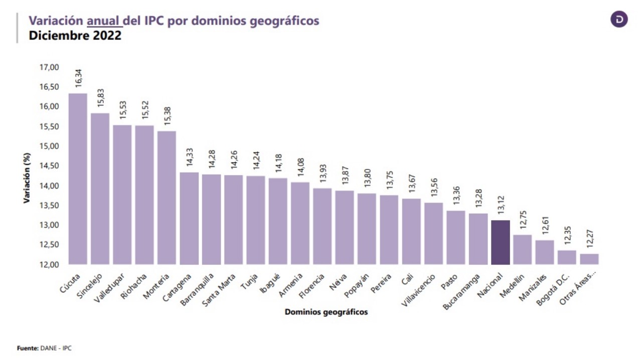 Además, cinco ciudades que presentaron una mayor inflación en el año 2022 fueron Cúcuta, Sincelejo, Valledupar, Riohacha y Montería. Por su parte, Medellín, Manizales y Bogotá fueron las que menor variación tuvieron.