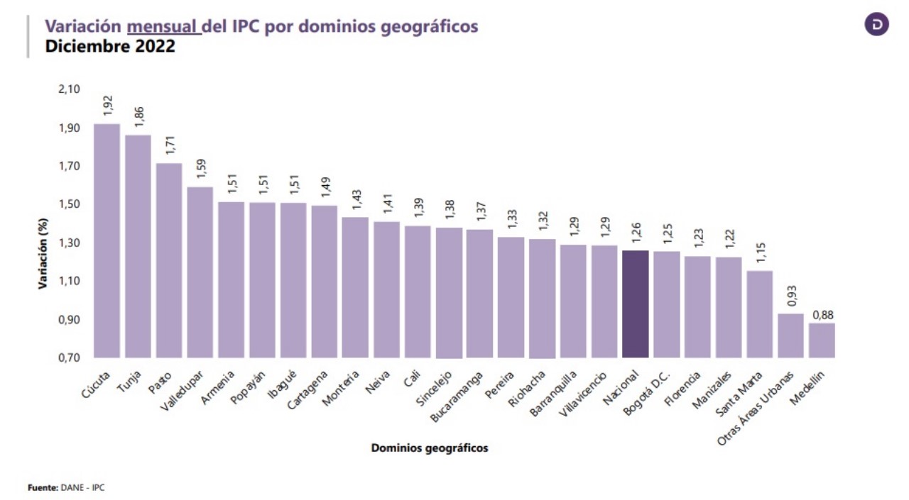 Por ciudades, Cúcuta fue la ciudad con mayor inflación mensual con 1,92 % y la de menor indicador fue Medellín con 0,88 %.