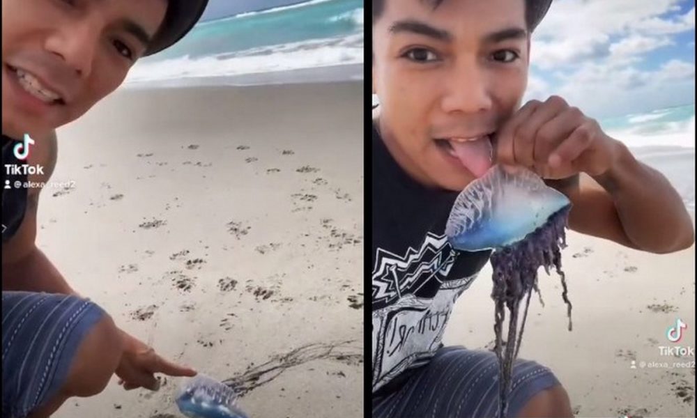 El joven conocido bajo el nombre de Alexa Reed en TikTok, compartió la grabación mientras sostenía la medusa que estaba en la orilla de una playa. Tras tocar y presionar el animal, el tiktoker se lleva la medusa a la boca y la toca con la lengua.
