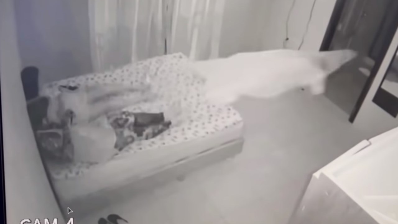 En la escena captada por una de las cámaras de seguridad de la casa se puede observar que cuando ellos estaban acostados en su cama, la sábana sale volando.