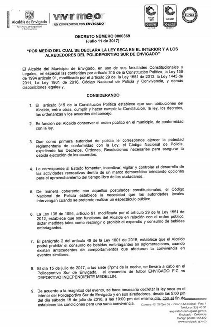 La Alcaldía de Envigado anunció que habrá Ley Seca en el interior y los alrededores del estadio Polideportivo Sur, con motivo del partido entre el Naranja y el Medellín.