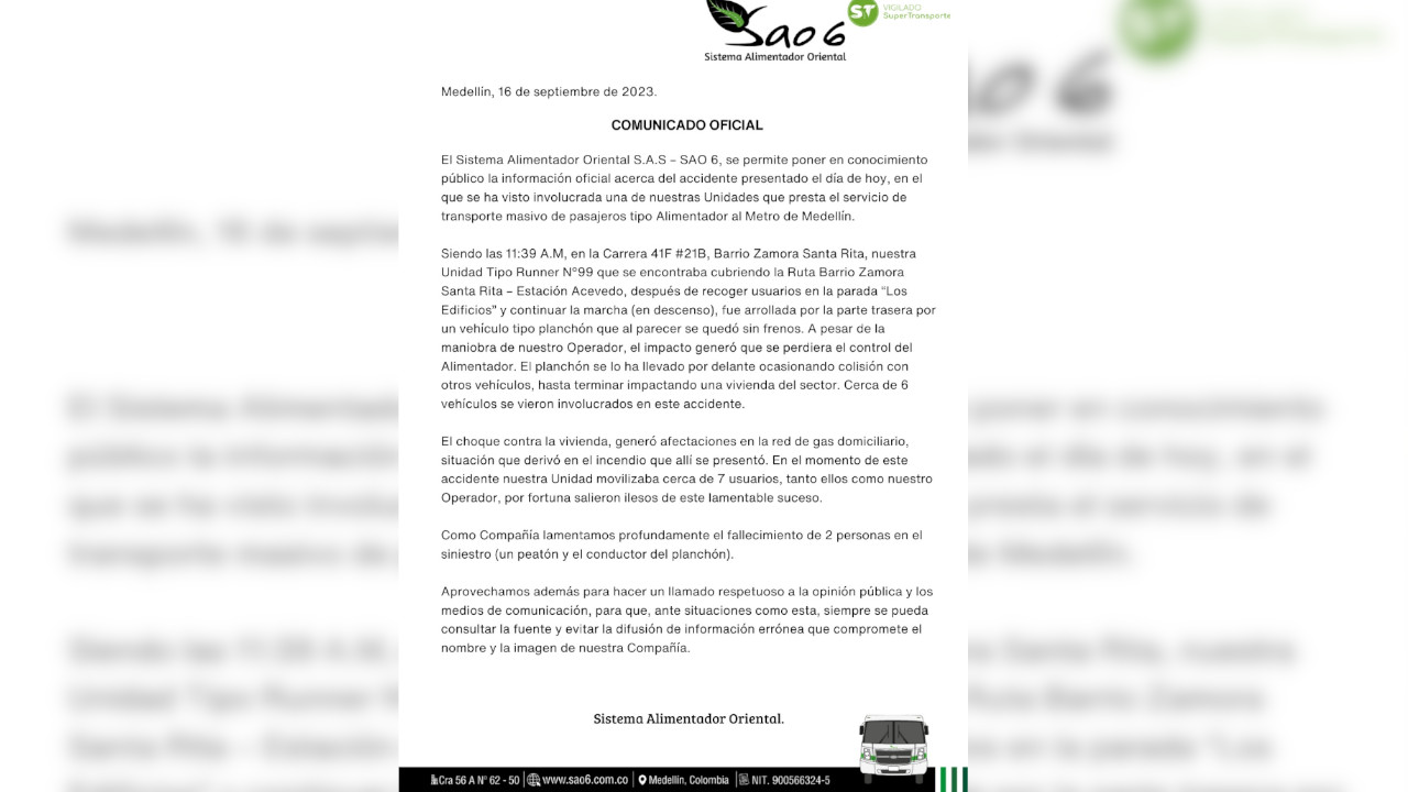 La compañía encargada del los buses integrados se pronunció referente al accidente ocurrido el día de hoy 16 de septiembre, en el barrio Zamora Santa Rita de Bello.