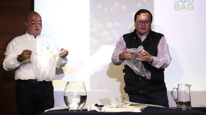 “(Con) este material, a parte de tener la ventaja de ser amigable, tú decides cuándo destruir la bolsa. La bolsa la puedes utilizar las veces que tu quieras. Pero si la bolsa se daña, en lugar de ir a tirarla, yo la disuelvo y me hago cargo del problema. Ese es el espíritu de este producto”, agregó Astete.