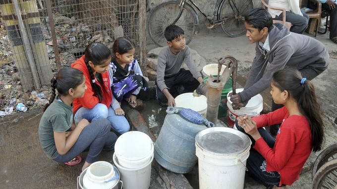 Niños rellenan con cubos y garrafas de agua en Nueva Delhi