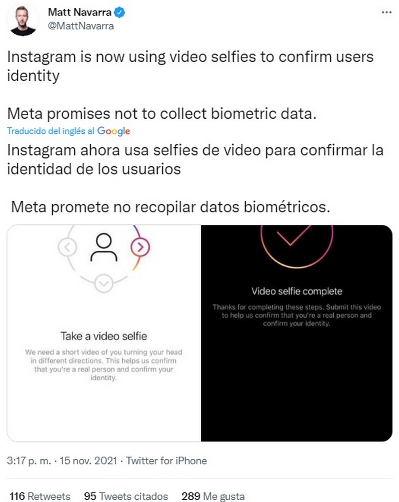 De acuerdo con lo señalado por el consultor Matt Navara, Instagram les pedirá a los usuarios que graben un video de 30 segundos de su cara para comprobar su identidad.