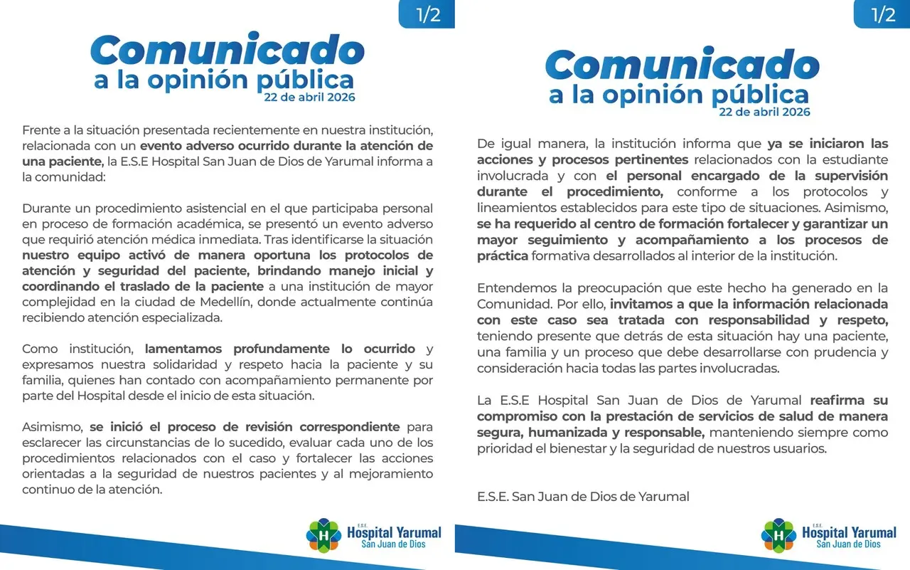 El hospital de Yarumal ha reiterado que mantiene contacto y acompañamiento permanente con la familia desde el primer minuto de la emergencia, expresando su “solidaridad y profundo respeto” por la situación que atraviesan.