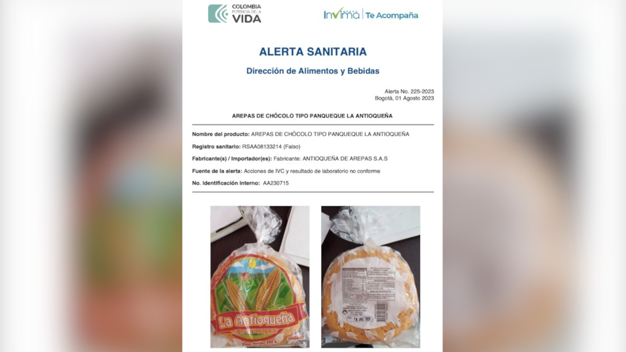 Invima lanza la alerta sanitaria hacia el producto de arepas de chócolo de La Antioqueña, que expide un registro sanitario falso. Además, encontraron que la fábrica de Antioquia de Arepas S.A.S no existe.