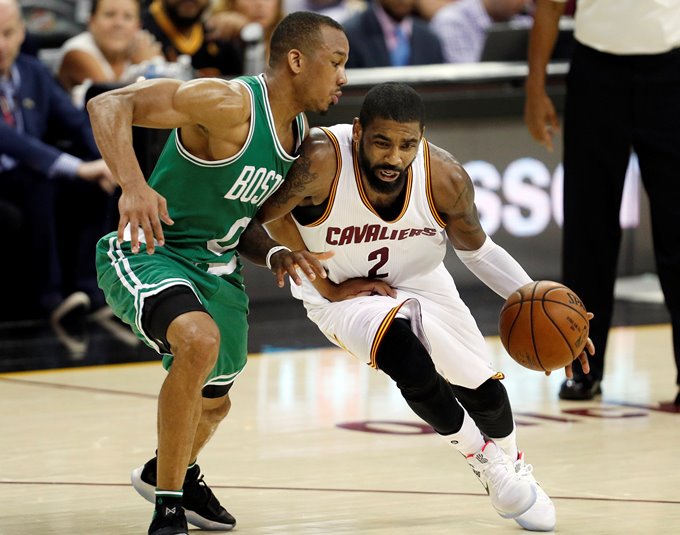 El jugador Kyrie Irving (d) de Cleveland Cavaliers en acción ante Avery Bradley de Boston Celtics durante el cuarto juego entre Boston Celtics y Cleveland Cavaliers de la NBA, que se disputa en el Quicken Loans Arena, en Cleveland (Estados Unidos). EFE