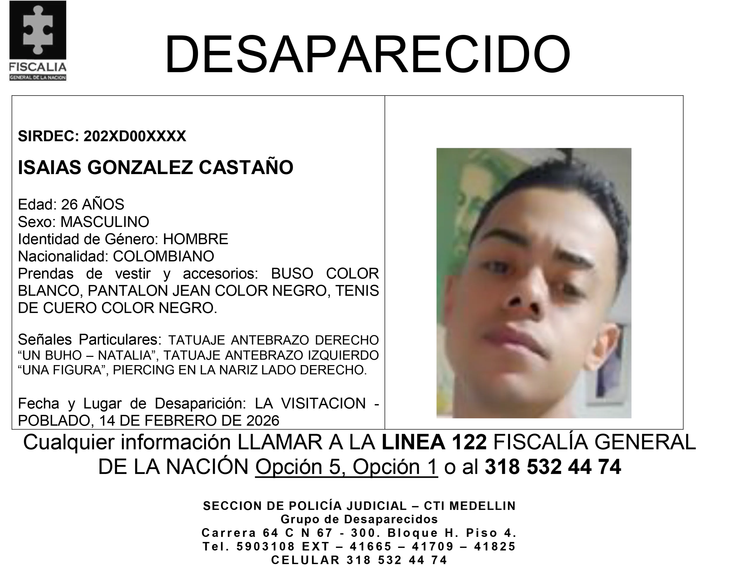 Isaías González Castaño, hombre colombiano de 26 años, fue reportado como desaparecido el 14 de febrero de 2026 en el sector de La Visitación, en El Poblado. Al momento de su desaparición vestía un buso blanco, pantalón jean negro y tenis de cuero negro.