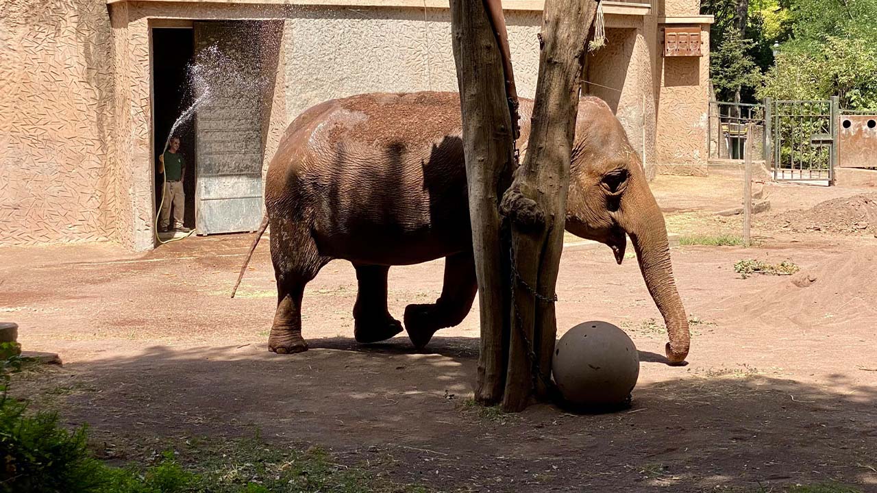 Un cuidador refresca con un manguerazo a un elefante en el Zoológico de Roma, este miércoles, tras otra jornada de calor extrema en el país que ha obligado al zoológico a tomar medidas para refrescar a todos los animales para que soporten mejor las temperaturas. EFE/ Raül Martínez Mendo