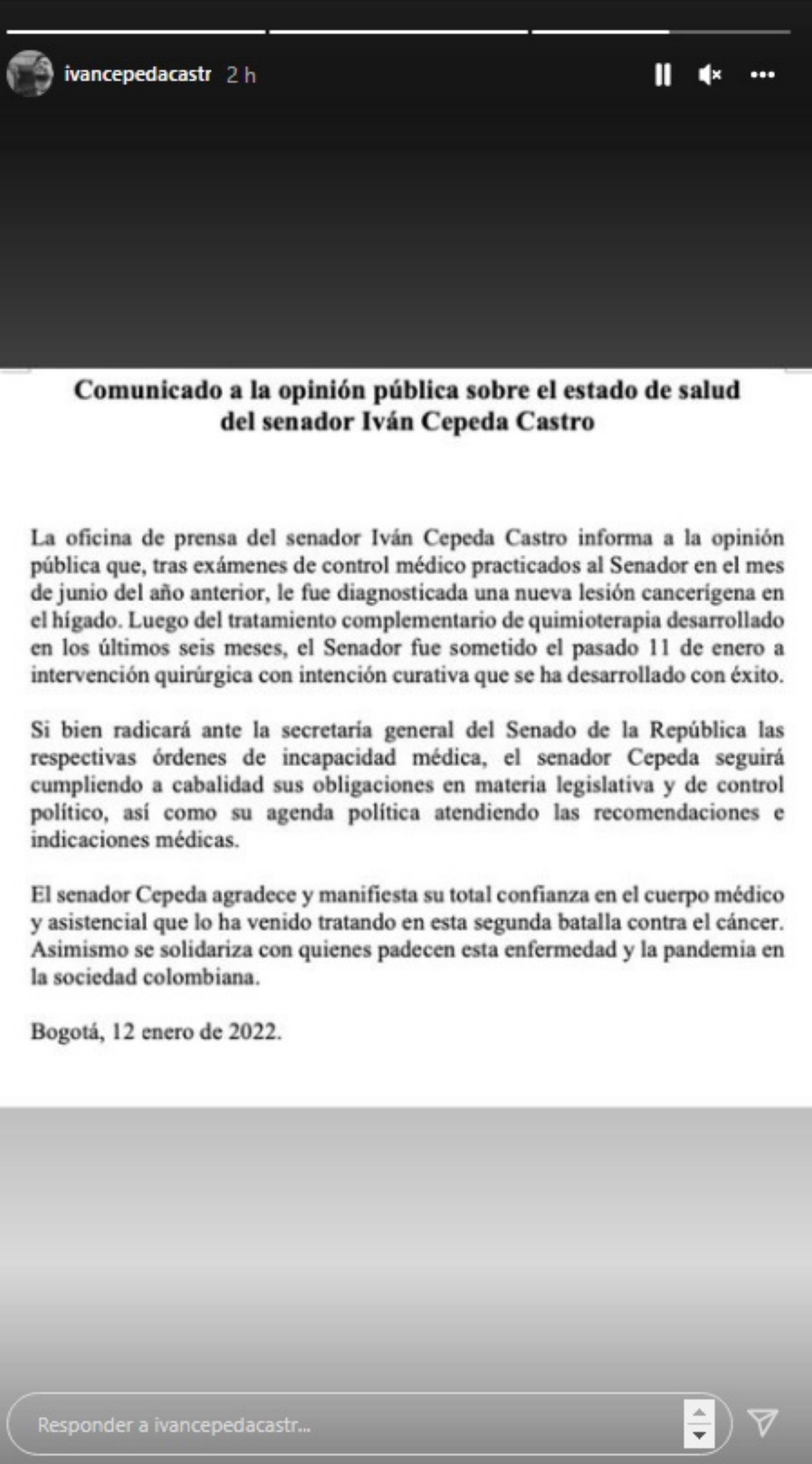 El senador Iván Cepeda anunció en la mañana de este miércoles, 12 de enero de 2022, que superó con éxito una intervención quirúrgica realizada el pasado 11 de enero.