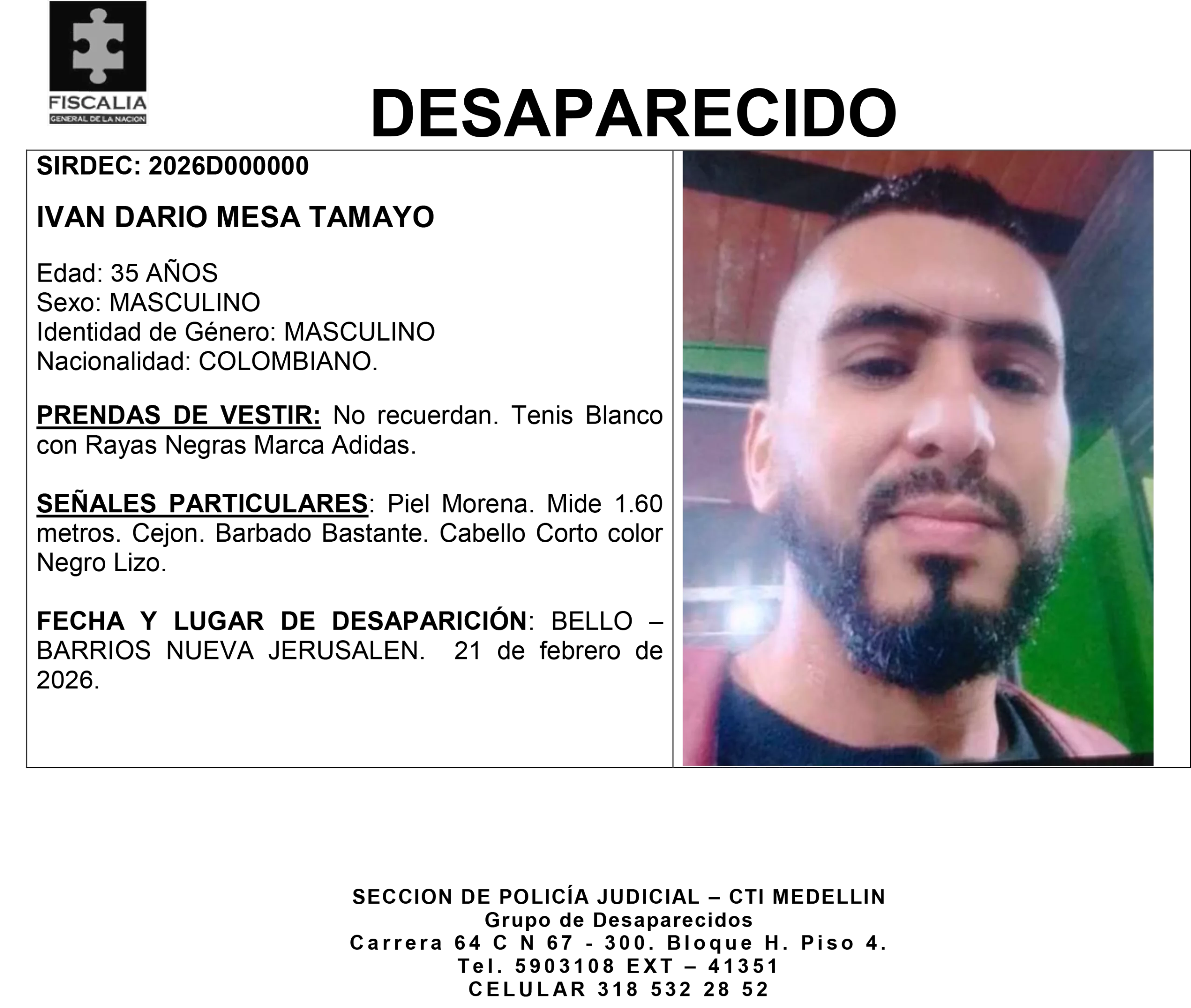 La desaparición ocurrió el 21 de febrero de 2026 en el municipio de Bello, específicamente en el barrio Nueva Jerusalén. Desde esa fecha no se tiene conocimiento sobre su paradero.