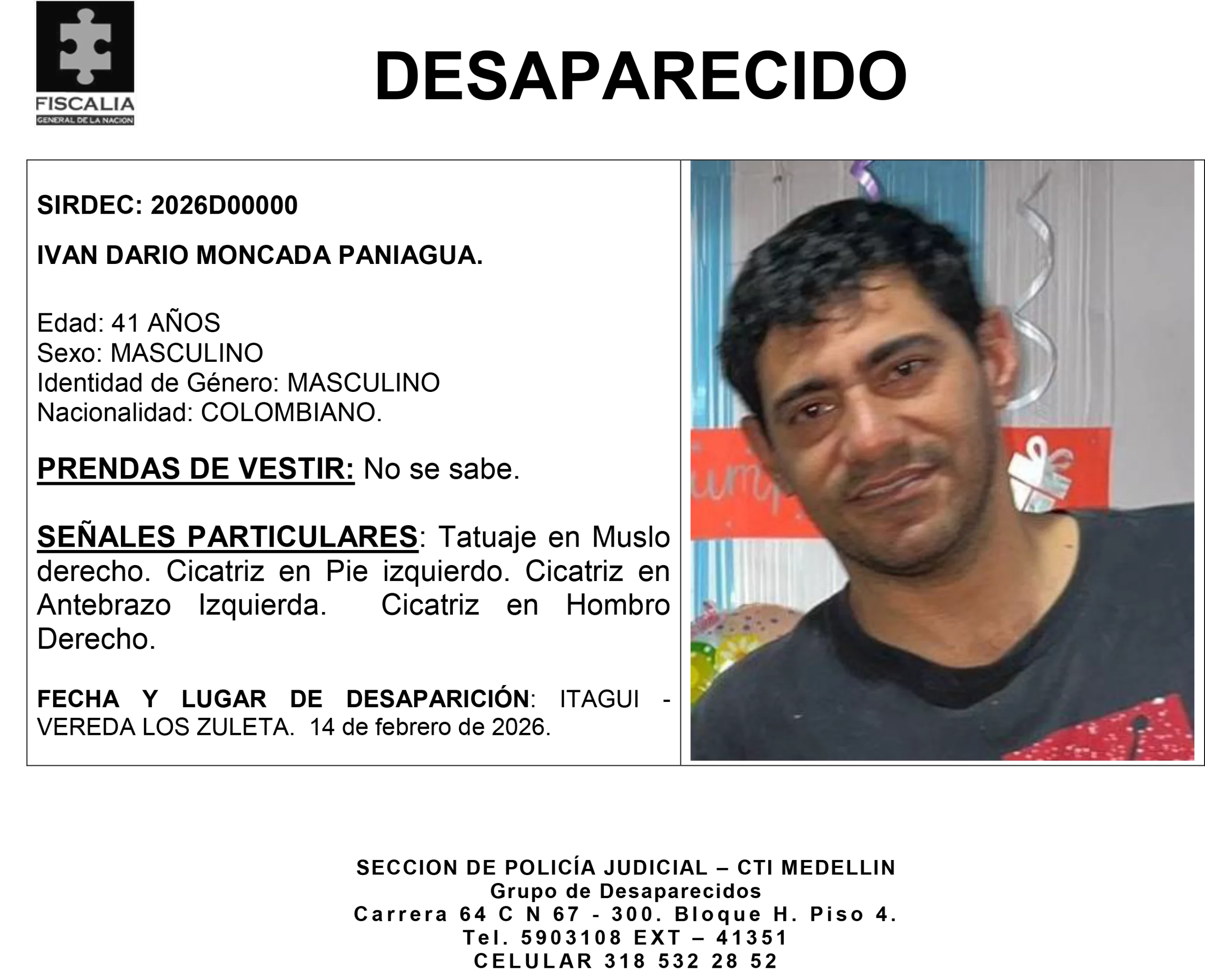 Su desaparición ocurrió el 14 de febrero de 2026 en el municipio de Itagüí, específicamente en la vereda Los Zuleta. Cualquier información que contribuya a su ubicación es de gran importancia.
