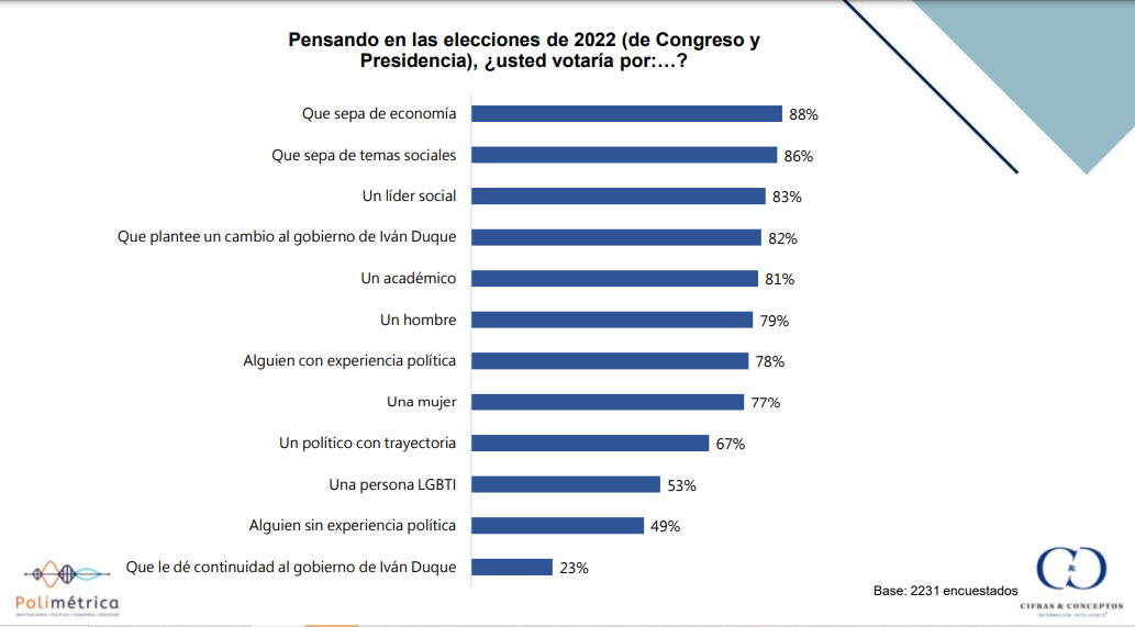 Uno de los puntos de la encuesta evaluó los motivos por los que votaría en 2022, y el 82% de los colombianos aseguró que buscan un candidato que “plantee un cambio al gobierno de Iván Duque”, además de otros aspectos que también terminan siendo importantes.