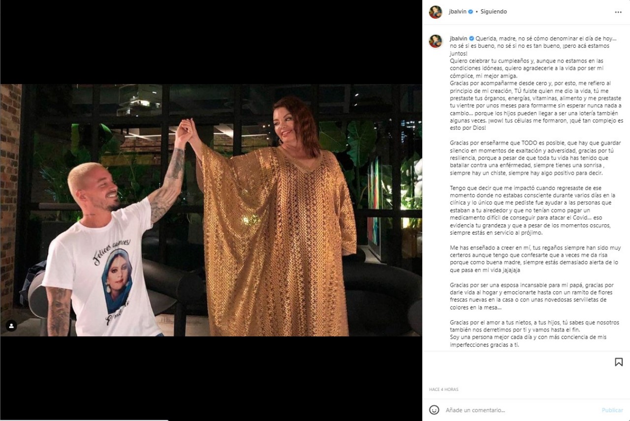 “Soy una persona mejor cada día y con más conciencia de mis imperfecciones gracias a ti. Te amo, vamos a salir adelante y, como siempre me dices: ‘no le tengamos miedo al miedo’¡Grande, madre! Como tú misma de haces llamar: ‘El Milagro'”, finalizó el mensaje de Balvin.