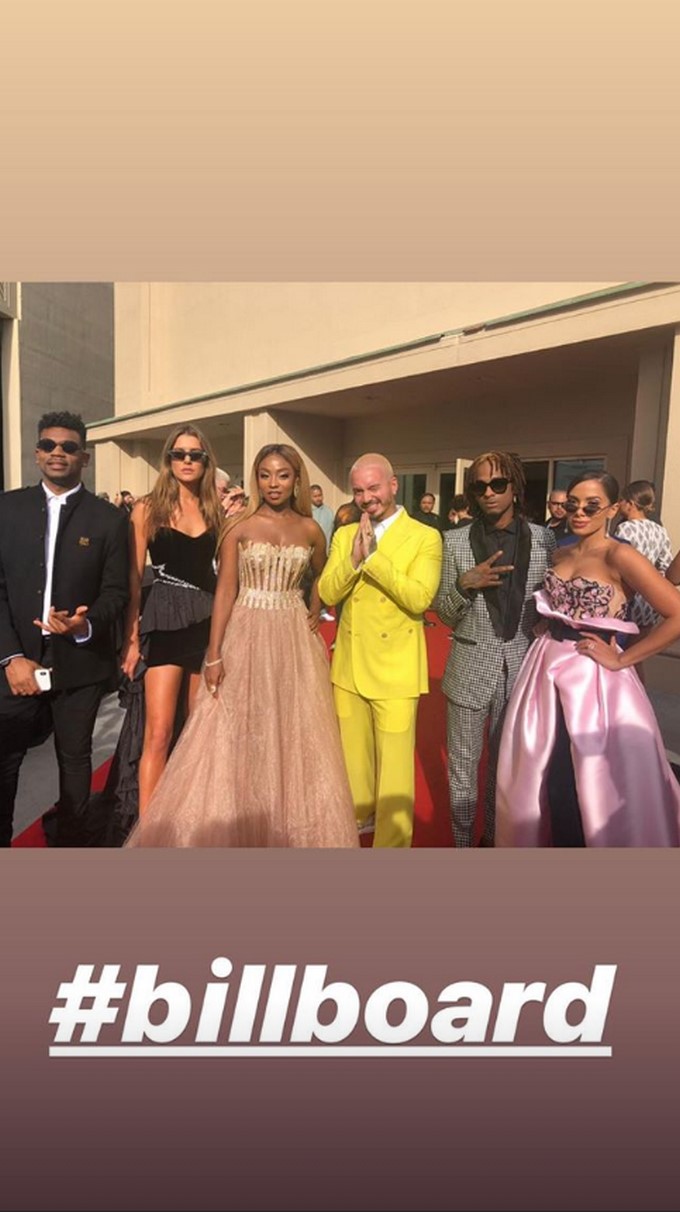 J Balvin, Valentina Ferrer y Chocquibtown en la alfombra roja de los Latin Billboard 2019. Foto: historia Instagram @valentinaferrerofficial.
